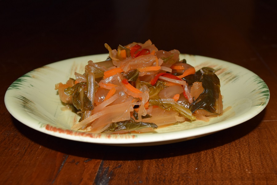 Kimchi is made by layering chopped cabbage with salt and seasonings such as soy sauce and ground dried red chili peppers. As with sauerkraut, other vegetables are often added, such as carrots, daikon (radish), and onion. There are at least 200 varieties of kimchi produced in Korea. So you can see that it’s a very adaptable technique.